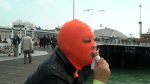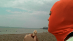 ‘Facekini’ is a video piece of the artist in a mask, designed for swimmers and beachgoers, which covers the head and reveals only the eyes, nose, and mouth. These ‘Facekini’ masks are popular in China, where the cultural belief is that ‘white skin’ is beautiful. A pale complexion is prized as feminine and the masks are worn for protection against UV rays and tanning.